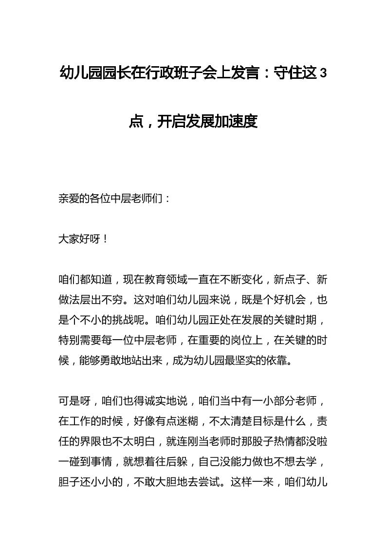幼儿园园长在行政班子会上发言:守住这3点,开启发展加速度 05-14 发言稿 1.34k ——预览已结束,还剩3页未读——开通会员后可免费下载高清完整文档 资源下载此资源下载价格为15米,VIP免费,请先登录 资源下载下载价格15 米VIP免费请先登录 0 0