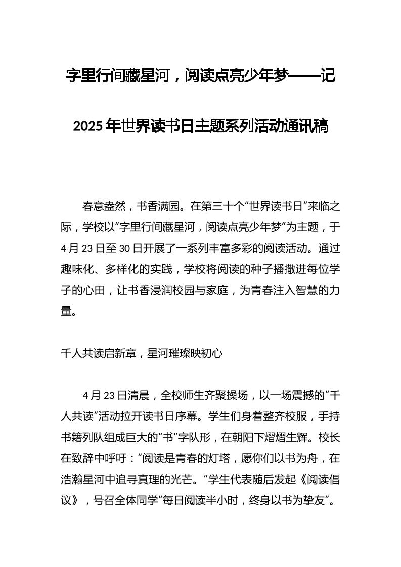 字里行间藏星河,阅读点亮少年梦——记2025年世界读书日主题系列活动通讯稿 05-19 管理相关 929 ——预览已结束,还剩2页未读——开通会员后可免费下载高清完整文档 资源下载此资源下载价格为15米,VIP免费,请先登录 资源下载下载价格15 米VIP免费请先登录 0 0