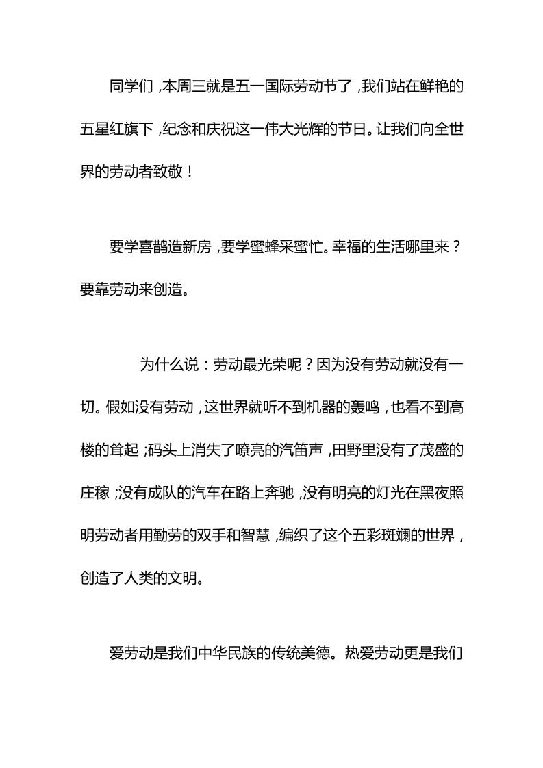 5.1劳动节校长在国旗下讲话劳动最光荣。希望同学们真正做到自己的事情自己做,学校的事情抢着做,家里的事情自觉做,从小养成好习惯 05-26 发言稿 609 ——预览已结束,还剩2页未读——开通会员后可免费下载高清完整文档 资源下载此资源下载价格为15米,VIP免费,请先登录 资源下载下载价格15 米VIP免费请先登录 0 0