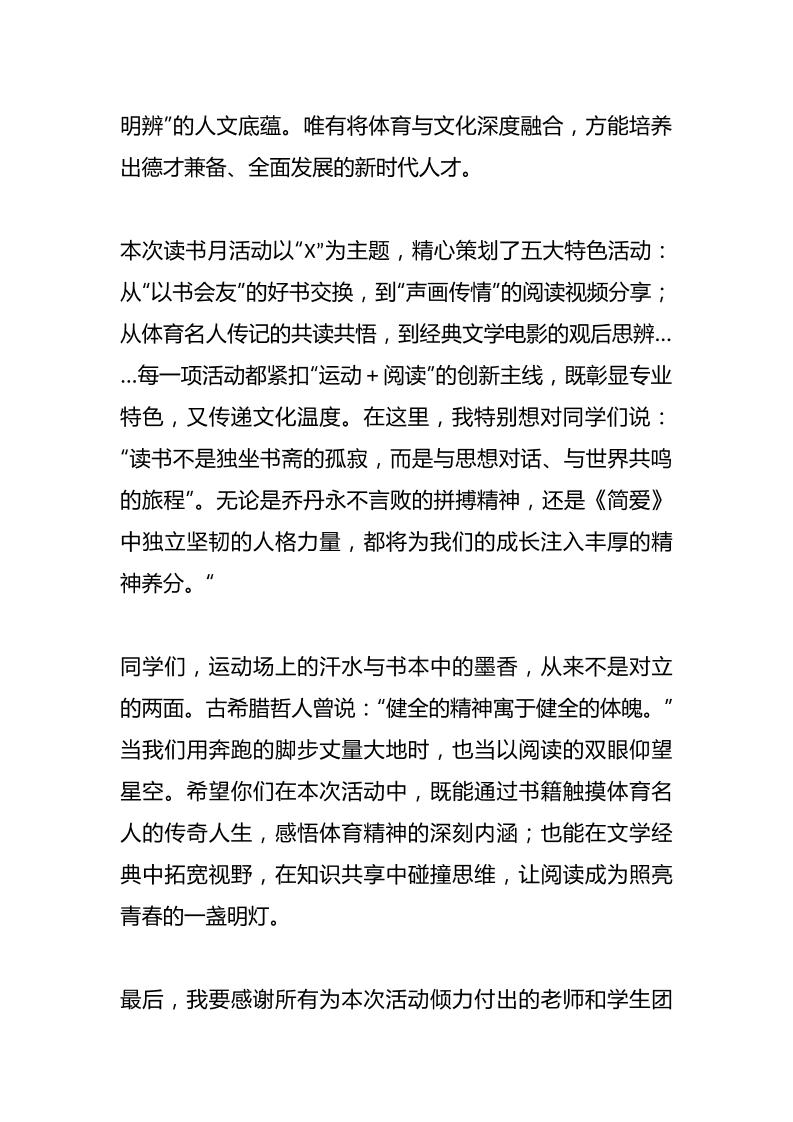院长在运动休闲学院2025年校园读书月活动启动仪式上的讲话 06-09 发言稿 616 ——预览已结束,还剩1页未读——开通会员后可免费下载高清完整文档 资源下载此资源下载价格为15米,VIP免费,请先登录 资源下载下载价格15 米VIP免费请先登录 0 0