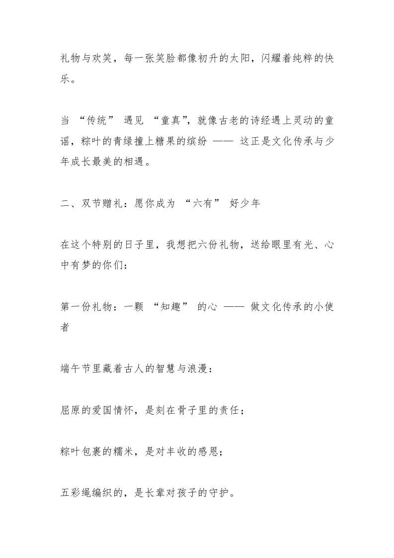2025六一儿童节遇上端午节,校长讲话:粽情六一,童样精彩 07-05 发言稿 545 ——预览已结束,还剩5页未读——开通会员后可免费下载高清完整文档 资源下载此资源下载价格为15米,VIP免费,请先登录 资源下载下载价格15 米VIP免费请先登录 0 0