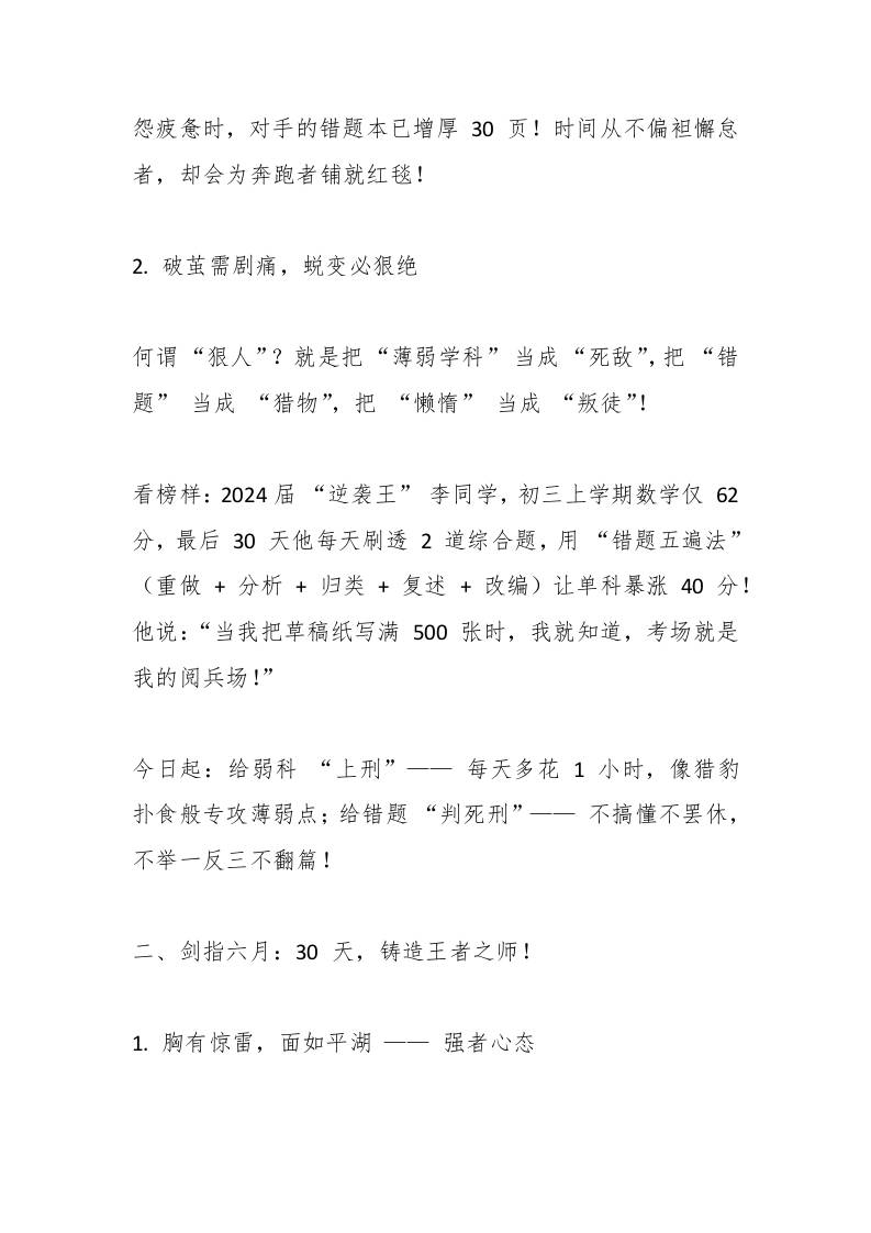 2025年中考倒计时30天,校长讲话:战鼓催征,剑指巅峰! 07-05 发言稿 1.08k ——预览已结束,还剩5页未读——开通会员后可免费下载高清完整文档 资源下载此资源下载价格为15米,VIP免费,请先登录 资源下载下载价格15 米VIP免费请先登录 0 0