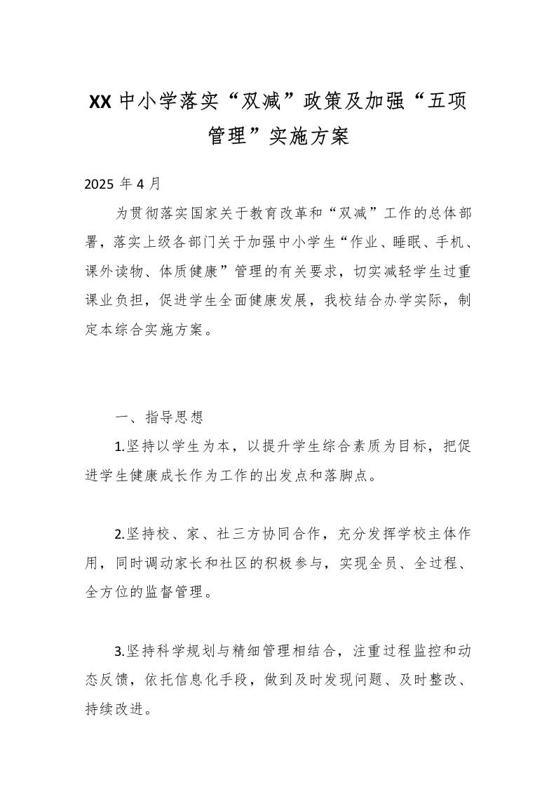 XX中小学落实“双减”政策及加强“五项管理”实施方案