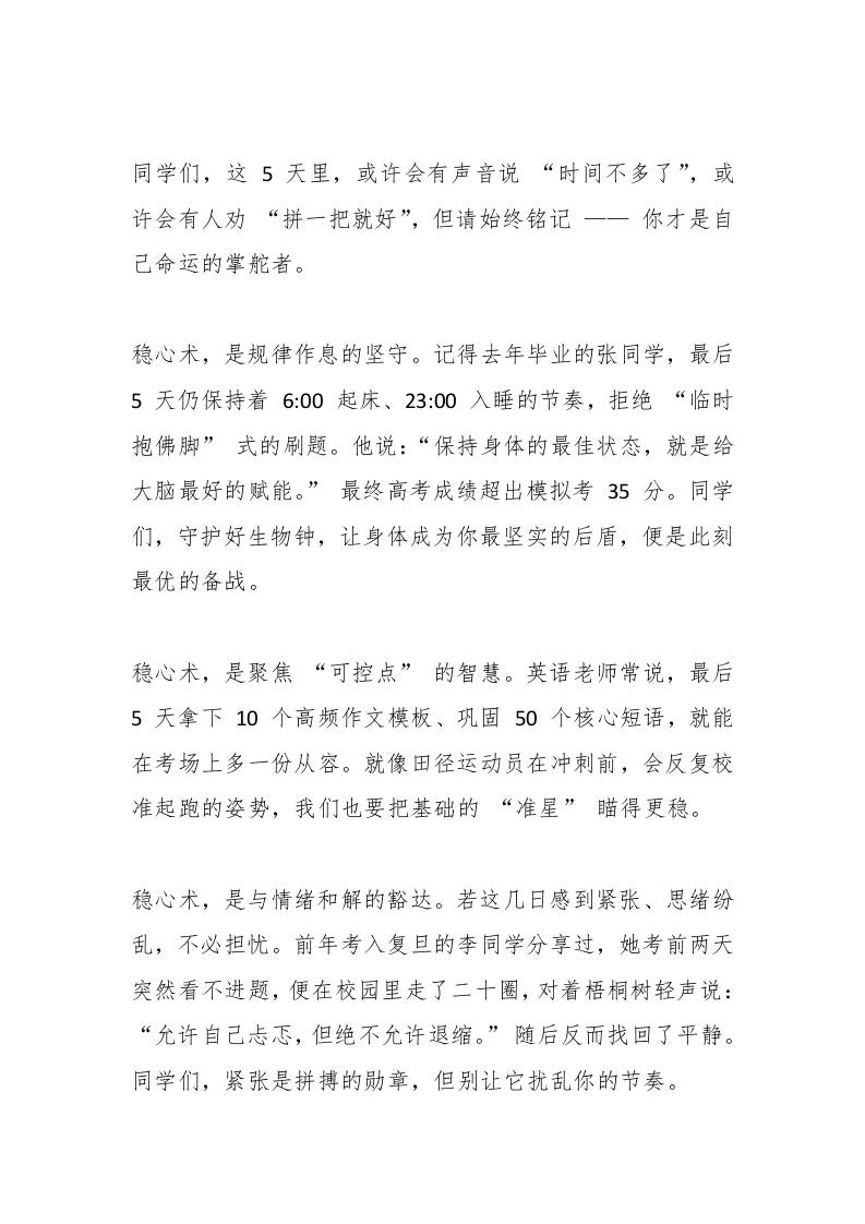 高考倒计时5天冲刺动员,校长讲话:用专注书写答卷,用坚持浇灌梦想 08-08 发言稿 1.24k ——预览已结束,还剩3页未读——开通会员后可免费下载高清完整文档 资源下载此资源下载价格为15米,VIP免费,请先登录 资源下载下载价格15 米VIP免费请先登录 0 0