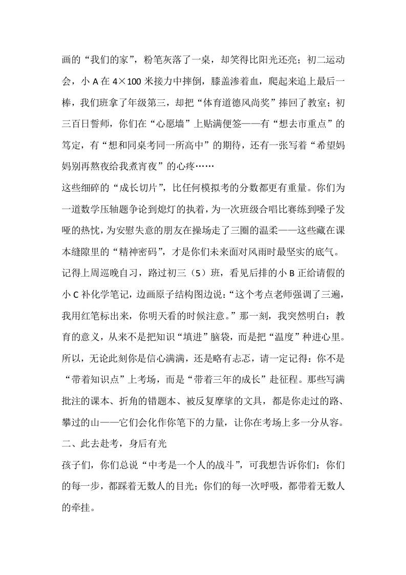 2025届中考壮行大会,校长讲话:愿你执笔赴考时,眼里有光;收卷返程处,心有星辰 09-02 发言稿 530 ——预览已结束,还剩4页未读——开通会员后可免费下载高清完整文档 资源下载此资源下载价格为15米,VIP免费,请先登录 资源下载下载价格15 米VIP免费请先登录 0 0