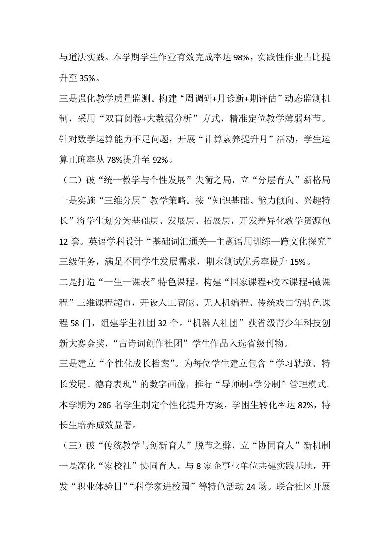 分管教学副校长期末工作总结:三破三立促双减,四维聚力提质量 09-03 工作总结 1.36k ——预览已结束,还剩4页未读——开通会员后可免费下载高清完整文档 资源下载此资源下载价格为15米,VIP免费,请先登录 资源下载下载价格15 米VIP免费请先登录 0 0